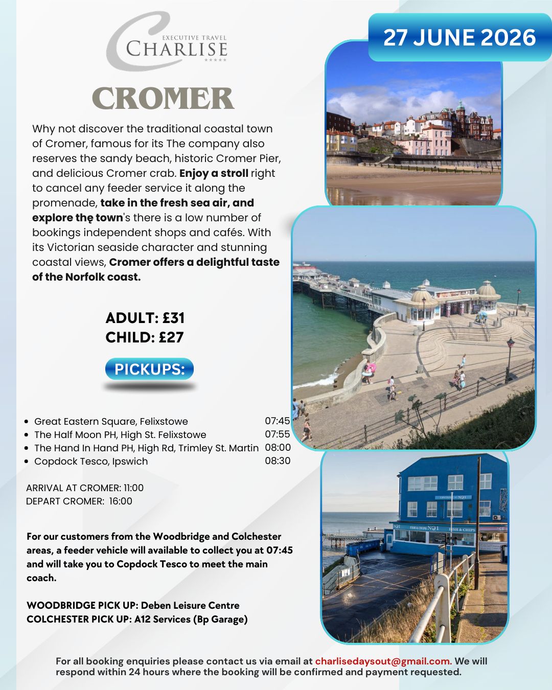 Sandy beach, historic Cromer Pier, and delicious Cromer crab on June 27, 2026.