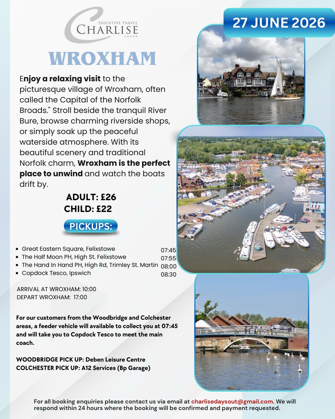 Enjoy a relaxing visit to the picturesque village of Wroxham on June 27, 2026.