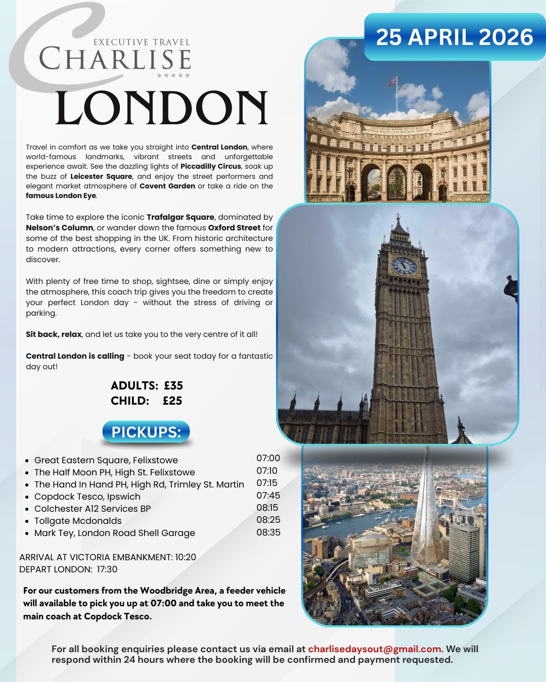 Travel in comfort as we take you straight into Central London on April 25, 2026.